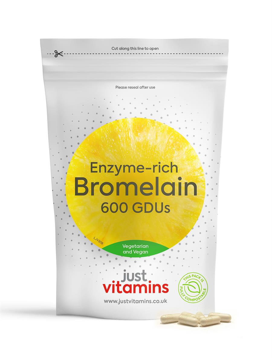 Just Vitamins Bromelain extract is manufactured from a carefully-chosen source of fresh pineapple stem, which are specially selected for their inherent rich mix of protein-digesting enzymes.