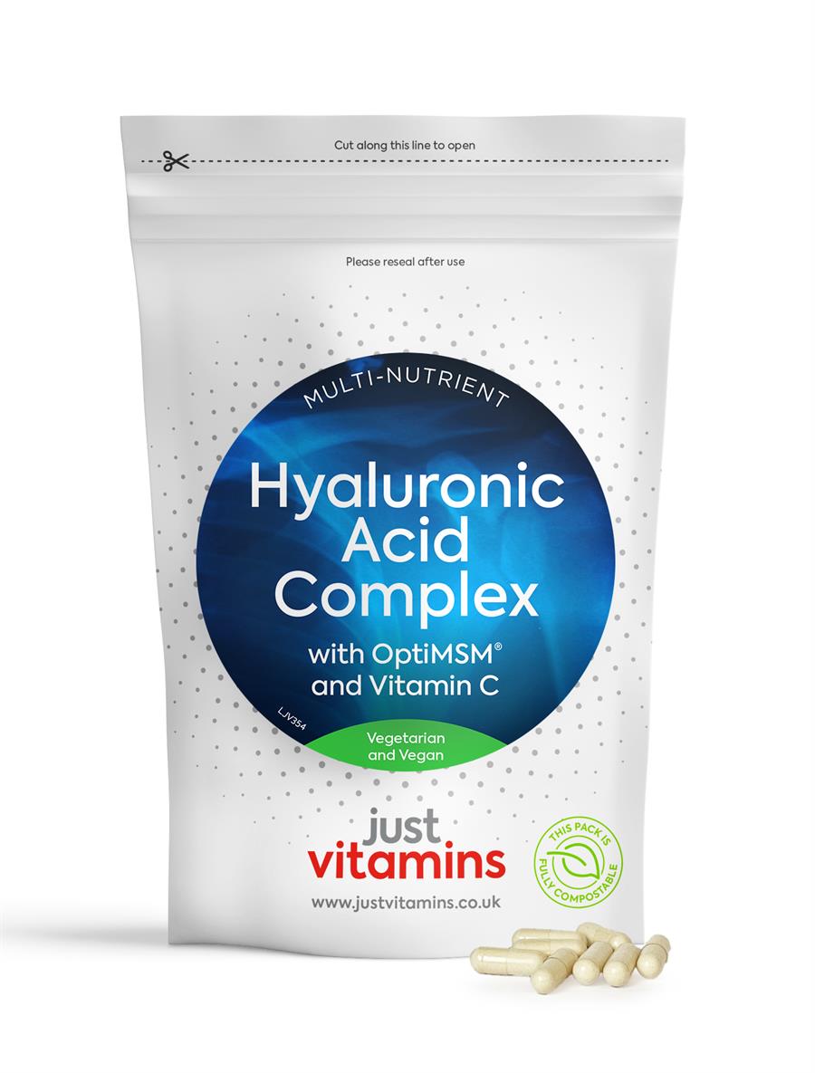 Just Vitamins fantastic Hyaluronic Acid Complex contains 50mg of Hyaluronic Acid, alongside Vitamin C & OptiMSM®, all in a single easy to swallow vegetarian capsule.