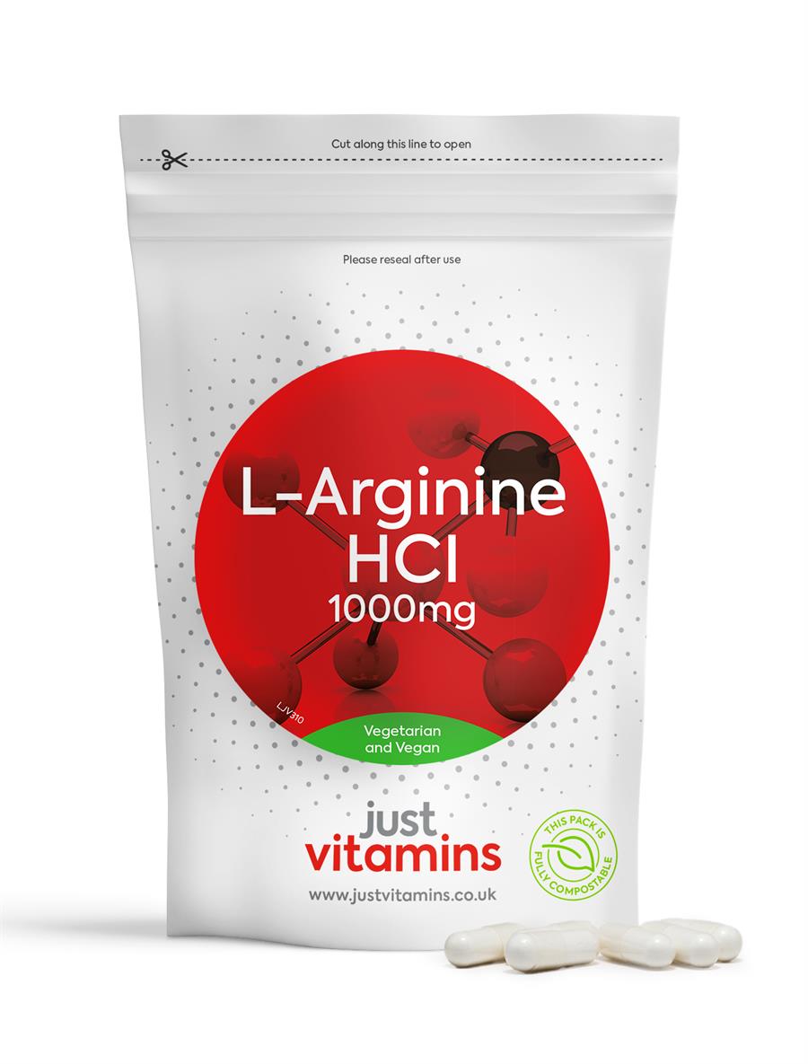 Just Vitamins' L-Arginine HCl high strength capsules provide 1000mg in each fully vegetarian capsule.