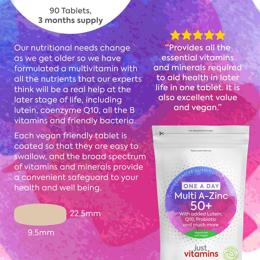 Calcium Carbonate with Maltodextrin, Bulking Agent (Microcrystalline Cellulose), Magnesium Oxide, Vitamin C (Ascorbic Acid, Hydroxypropyl Methylcellulose), Potassium Chloride, Coating (Calcium Carbonate, Hydroxypropyl Methylcellulose, Isomalt, Medium Chain Triglycerides), Vitamin E (DL Alpha Tocopherol Acetate, Modified Corn Starch, Silicon Dioxide), Nicotinamide, Ferrous Fumarate, Calcium D-Pantothenate, Anti-caking Agent (Silicon Dioxide), Zinc Oxide, Anti-caking Agent (Magnesium Stearate), Marigold Extract with Maltodextrin, Beta Carotene Beadlets (Green Algae (Dunaliella Salina) Extract, Gum Arabic), Vitamin A (Maltodextrin, Gum Arabic, Modified Starch, Vitamin A Acetate, DL-Alpha Tocopherol), Colour (Caramel), Manganese Sulphate, Green Tea 10:1 Leaf Extract, Vegan Vitamin D3 (Corn Syrup, Arabic Gum, Cholecalciferol Oil (Lichen Extract, Fractionated Coconut Oil, D-Alpha Tocopherol), Silicon Dioxide, Sodium Ascorbate), Pyridoxine Hydrochloride, Vitamin B12 (Dicalcium Phosphate, Cyanocobalamin), Riboflavin, Thiamine Hydrochloride, Cupric Sulphate Anhydrous, Coenzyme Q10, Vitamin K1 (Maltodextrin, Phylloquinone), Lactobacillus Casei, Lactobacillus Rhamnosus with Maltodextrin, Black Pepper Extract (BioPerine®), Chromium Picolinate, Folic Acid, Bifidobacterium Animalis Subsp. Lactis, Lactobacillus Acidophilus, Potassium Iodide, Sodium Selenate, Lactobacillus Plantarum, Streptococcus Thermophilus, Sodium Molybdate, D-Biotin.