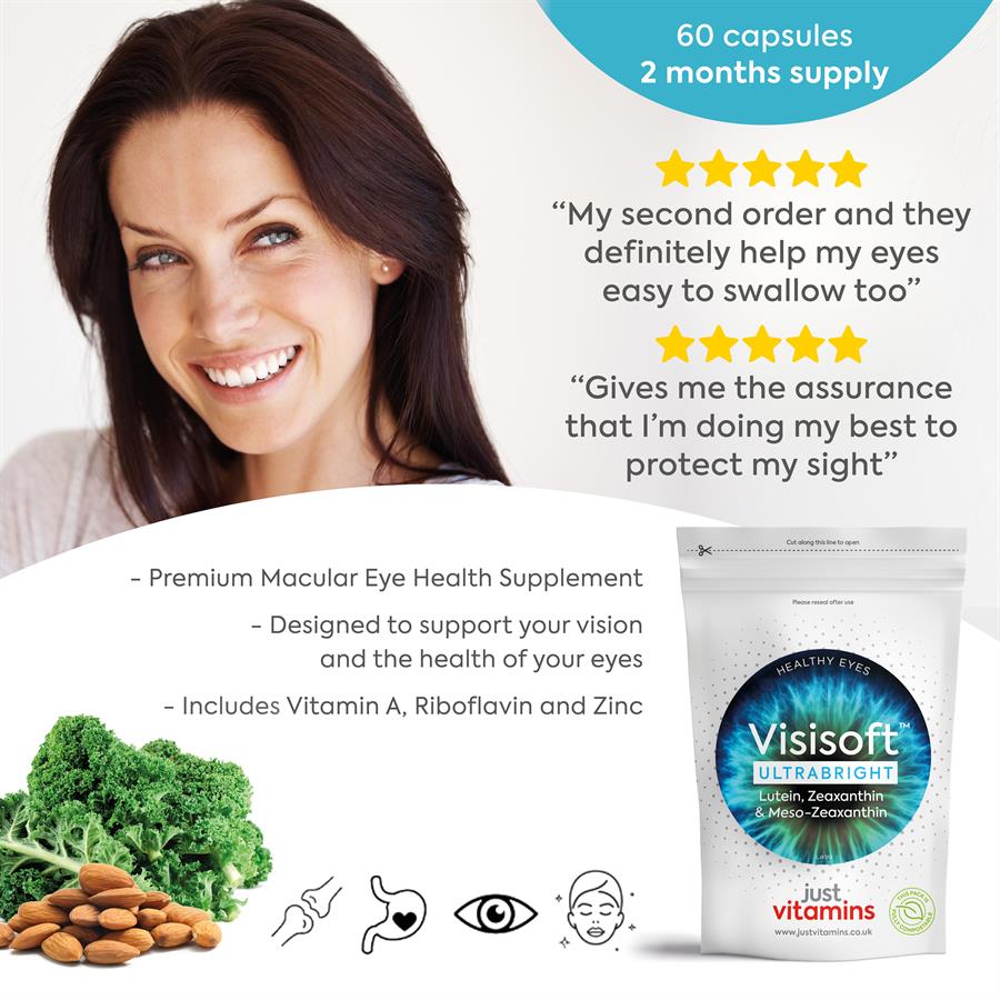Visisoft™ UltraBright is is our top eye health supplement, containing Lutein, Zeaxanthin and Meso-Zeaxanthin, with added Vitamin A, Riboflavin and Zinc specially formulated to look after the health of your eyes. Unfortunately, age related vision problems are becoming more and more common as we are living longer lives. It is therefore important that you do everything you can to protect the health of your eyes now, so they are able to serve you better in older age.