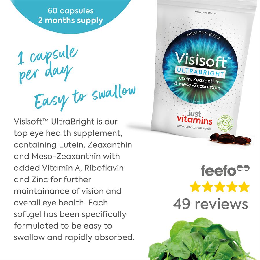 Visisoft™ UltraBright is is our top eye health supplement, containing Lutein, Zeaxanthin and Meso-Zeaxanthin, with added Vitamin A, Riboflavin and Zinc specially formulated to look after the health of your eyes. Unfortunately, age related vision problems are becoming more and more common as we are living longer lives. It is therefore important that you do everything you can to protect the health of your eyes now, so they are able to serve you better in older age.